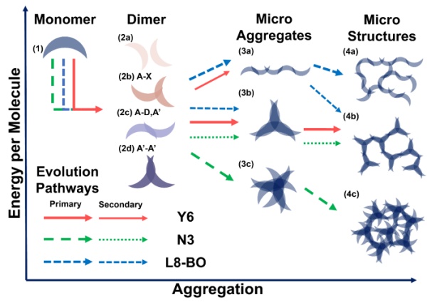 為了探究分子結構在大面積有機光伏器件制備的成膜動力學中的影響,該團隊選擇了三個烷基鏈存在細微區別的Y系列同系物分子(Y6、N3、L8-BO)與PM6共混,采用狹縫涂布法制備大面積有機光伏器件。該工作采用原位吸收光譜、原子力顯微鏡及掠入射廣角X射線散射,并結合分子動力學模擬的結果解析成膜動力學機制。原位光譜表征表明三種結構相似的受體分子在成膜時吸收光譜演化趨勢存在顯著差異,呈現出“生長”和“移動”的二元模式(圖1)。后續的多尺度結構分析表明,三種不同的分子呈現出不同的聚集形態特征,且分子堆積模式存在明顯區別。從分子動力學中提取出的星型三聚體及其進一步組裝形成的聚集體,其特征能夠同時體現“生長”模式的吸收光譜演化以及符合掠入射廣角X射線散射結果。基于以上實驗和模擬結果,該研究提出了聚集控制的大面積有機光伏器件制備成膜動力學(圖2)。動力學模型提出,分子烷基鏈與主骨架相互競爭導致分子聚集類型的變化,進而逐層級地決定有機光伏器件的活性層形貌及器件性能。聚集態的分布由分子結構本征決定,但可通過濃度、溶液溫度和給體-受體分子的相互作用進行調制,為有機光伏材料的分子設計及加工工藝調整提供了重要參考。