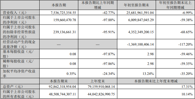 中國粉體網(wǎng)訊 10月30晚間,鋰電巨頭贛鋒鋰業(yè)公布三季度報告。報告顯示,前三季度該公司營收為256.8億元,同比下降6.99%;歸母凈利潤60.1億元,同比下降59.38%,扣非凈利潤43.52億元,同比下降68.65%。其中,第三季度贛鋒鋰業(yè)業(yè)績下挫明顯,單季營收為75.37億元,同比下降42.77%。僅實現(xiàn)歸母凈利潤1.6億元,同比下滑97.88%。