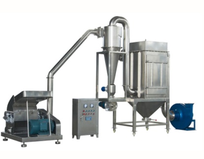 設備利用固定齒盤與活動錘片間的相對運動,使物料在機腔內被沖擊剪切而快速獲得粉碎。粉碎后的物料經離心力和引風機的作用,自動進入旋風分離器,成品經過出料風機收集,粉塵自動吸入除塵箱,經過布袋過濾、回收,降低物料的損耗率,有效改善工作環境。