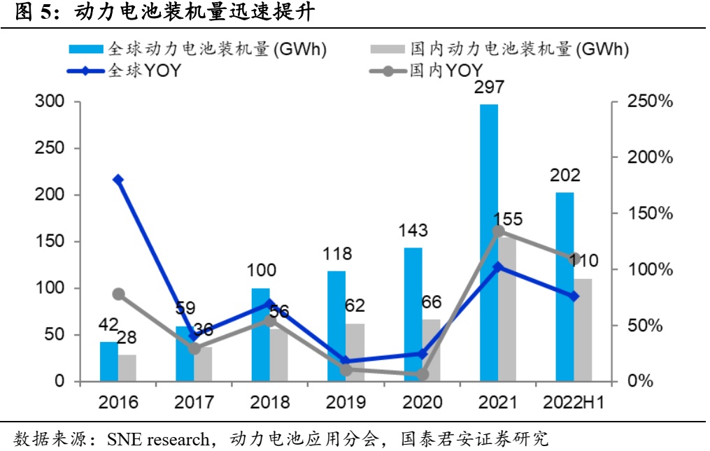 新能源汽車銷量快速增長,推動鋰離子動力電池行業持續景氣。2021年,全球動力電池裝機量快速攀升,達到297 GWh,約占全球鋰電池總需求量的62%。2022年上半年,全球動力電池裝機量達到202 GWh,同比增長76.0%。其中,國內動力電池裝機量達到110 GWh,同比增長109.8%,占比全球超過5成。