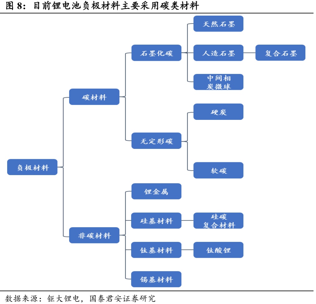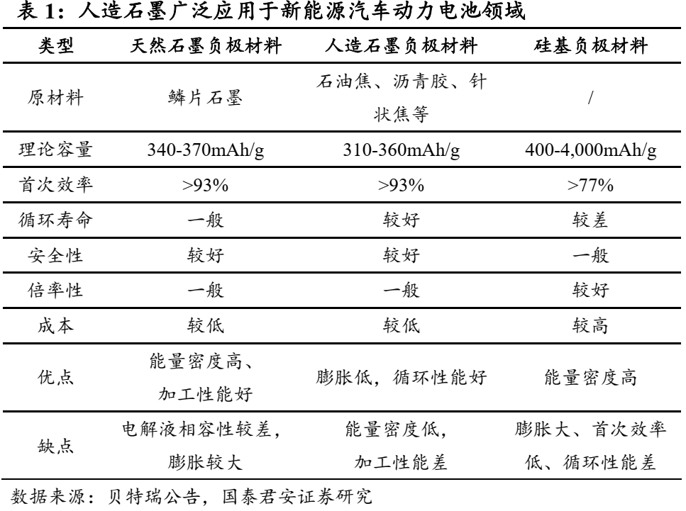 受益汽車電動化,人造石墨負極成為主要的負極材料品種。目前鋰離子電池負極材料包括天然石墨材料、人造石墨材料、硅基及其他負極材料;主流的負極材料為天然石墨材料和人造石墨材料,鑒于兩者材料在成本、能量密度、循環壽命、快充倍率、加工性能等因素的差異,目前前者主要用于消費電子領域,后者逐步成為動力電池負極材料首選。