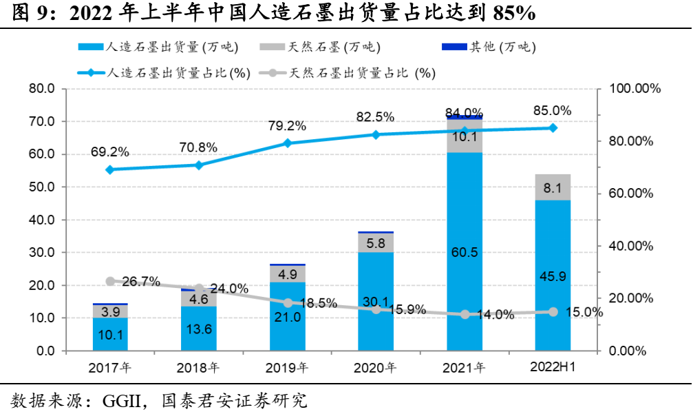 人造石墨在負極材料出貨量中的占比逐年提高。根據GGII統計,我國人造石墨的出貨量由2017的10.1萬噸上升到2021年的60.5萬噸,CAGR 56.4%,在負極材料中占比從2017年的69.2%上升到2021年的84.0%。2022年上半年我國人造石墨市場占比為85%,占比進一步提升。