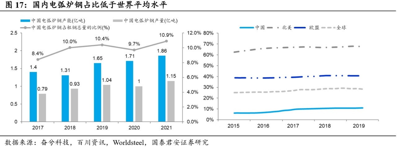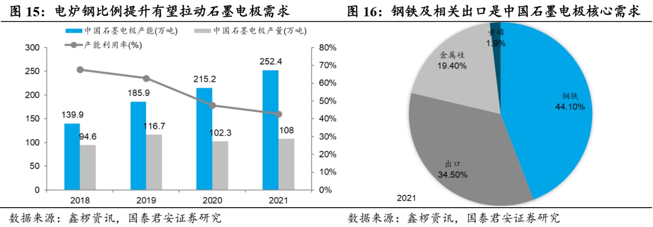 石墨電極主要用于電爐煉鋼、工業硅、磨料、黃磷等行業,電爐鋼占比提升拉動石墨電極需求增長。2021年中國石墨電極產量為108萬噸,中國石墨電極總需求量達到107.2萬噸,其中出口量達到37萬噸(占比34.5%),國內電極需求量約70.2萬噸(占比65.5%)。國內鋼鐵行業電極需求量約47.3萬噸(占比44.1%),主要用于電爐煉鋼和爐外精煉。由于電爐煉鋼相比高爐煉鋼更加環保,在碳中和背景下,電爐鋼占比提升有望拉動石墨電極需求。根據Mysteel統計,2021年我國粗鋼產量10.50億噸,其中電弧爐鋼占粗鋼總產量的10.9%,約為1.15億噸。2022年1月,工信部、發改委、生態環境部聯合發布的《關于推動鋼鐵工業高質量發展的指導意見》提出“有序引導短流程煉鋼(電爐)”,談及爭取在“十四五”末(2025年)實現“電爐鋼產量占粗鋼總產量比例提升至15%以上,力爭達到20%”的目標。考慮到目前我國鋼材消費逐漸接近峰值,且粗鋼產量受控,若考慮2025年我國鋼材消費5%下滑且電爐鋼比例提升至20%,則2025年我國電爐煉鋼石墨電極需求量將提升至82.4萬噸。假設出口,金屬硅等其他方面需求量3%的平穩增長,則2025年中國石墨電極總需求量約為150萬噸,CAGR 8.8%。