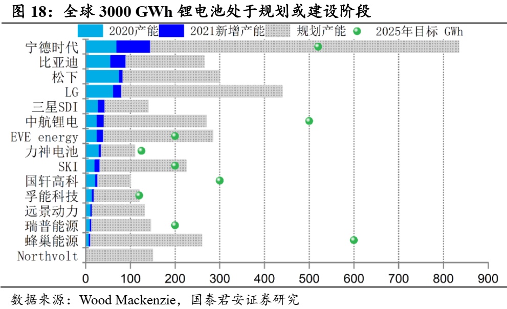人造石墨負極材料成為拉動石墨化需求主力。根據Wood Mackenzie統計,2021年計劃產能排名前15位的動力電池廠商共投產約200 GWh,累計產能達到600 GWh。同時,3000 GWh處于規劃或建設階段。我們預計,2025年全球鋰電池需求量有望達到2108 GWh,對應的負極材料需求量約為253萬噸,若考慮人造石墨占比85%,則人造石墨的需求量約為215萬噸。基于石墨化90%的收率假設,2025年對石墨化的需求約為239萬噸,CAGR 36.9%。
