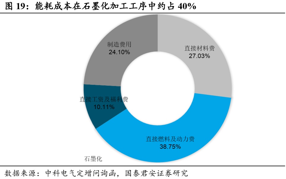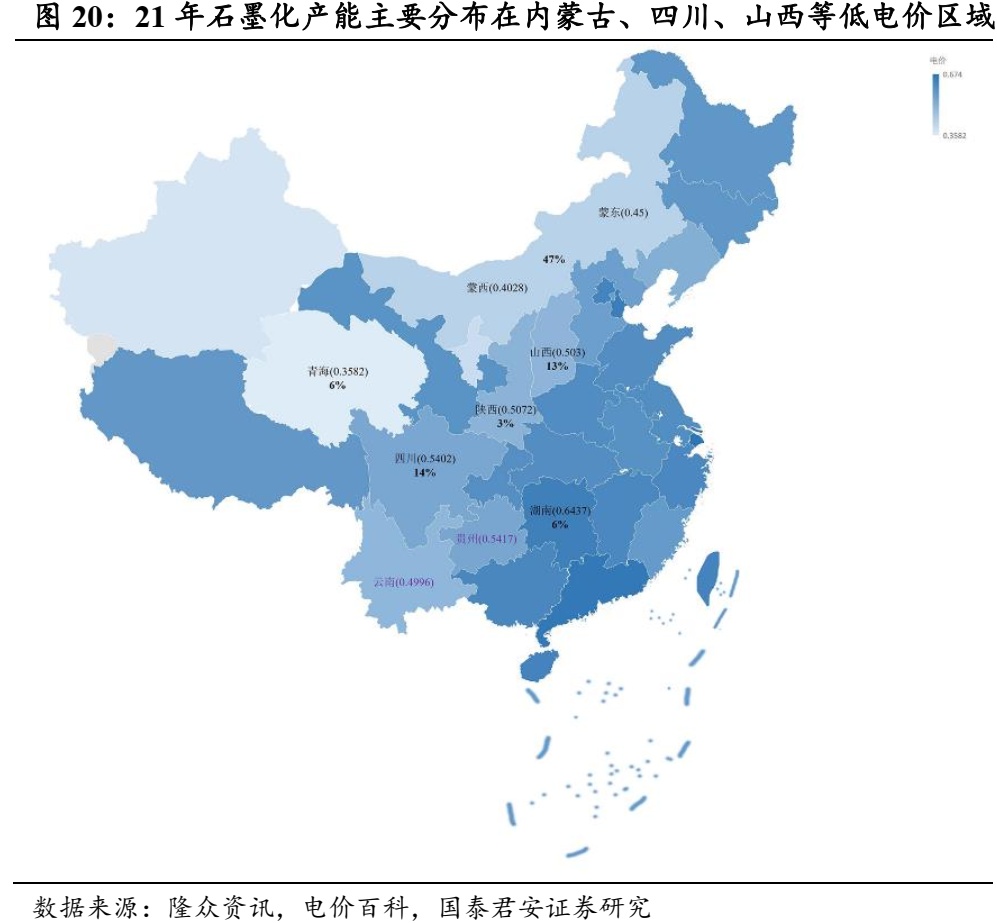 石墨化屬于高耗能行業,國內負極石墨化產能主要位于電價較低地區。石墨化是通過高溫熱處理實現對原子重排及結構轉變的過程,單噸物料石墨化處理約需要7000-14000度電,故電費在石墨化成本中占比高達40%。從地域上看,負極石墨化產能主要分布在內蒙古、四川、山西等地電價較低區域。