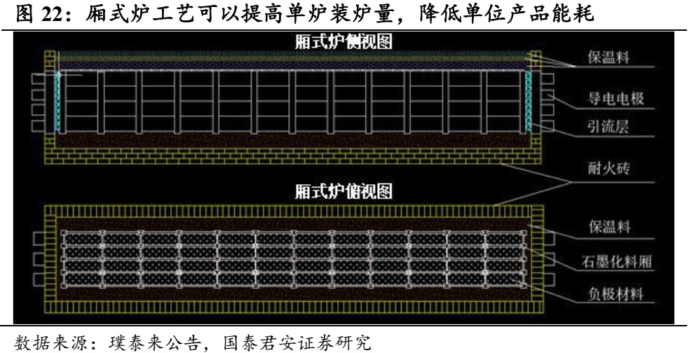廂式法大幅提高單爐量,降低能耗,頭部負極企業逐步導入。石墨化工藝的關鍵環節之一是裝爐,廂式爐工藝相較于坩堝法可以提高單爐裝爐量。廂式爐工藝將整個爐芯空間分成若干個等容積腔室,負極材料直接放置于石墨板材所圍成的廂體空間中,石墨板材具有導電性,廂體通電后自身發熱,在作為負極材料容器的同時能夠達到材料加熱的目的。廂式爐工藝避免了負極材料重復裝入、裝出坩堝工作,且由于廂體自身材質及形狀特點,廂體之間無需添加保溫電阻料,僅需保留廂體四周與爐壁之間的保溫材料,增大了爐內負極材料的有效容積及使用效率。根據璞泰來定增回復函,箱式爐工藝可以使單爐有效容積成倍增加,于此同時總耗電量僅增加約10%,從而帶來產品單位耗電降低40%-50%左右。與坩堝裝填方式相比,廂式法工藝廂板拼接過程精度較高,裝料吸料操作難度加大,加熱過程需更加精確地控制送電曲線及溫度測量,所以整體對石墨化工藝掌握程度及技術優化水平要求較高,目前行業內僅有貝特瑞、璞泰來、杉杉股份、凱金能源、翔豐華等少數頭部企業掌握并規模化使用。