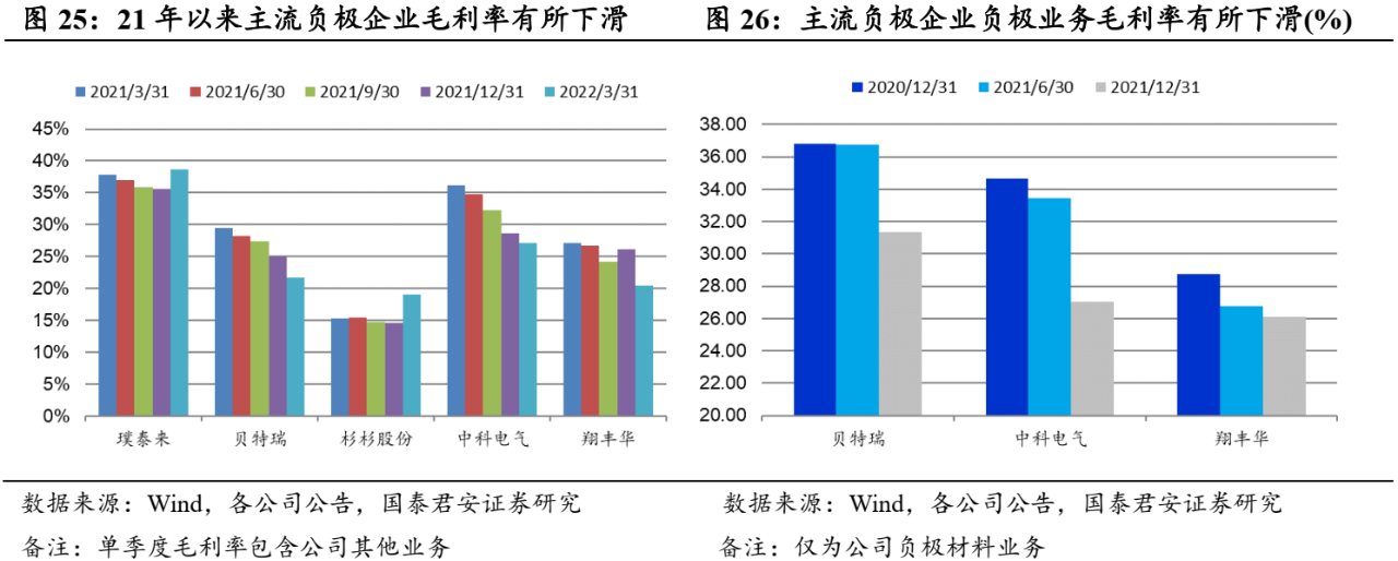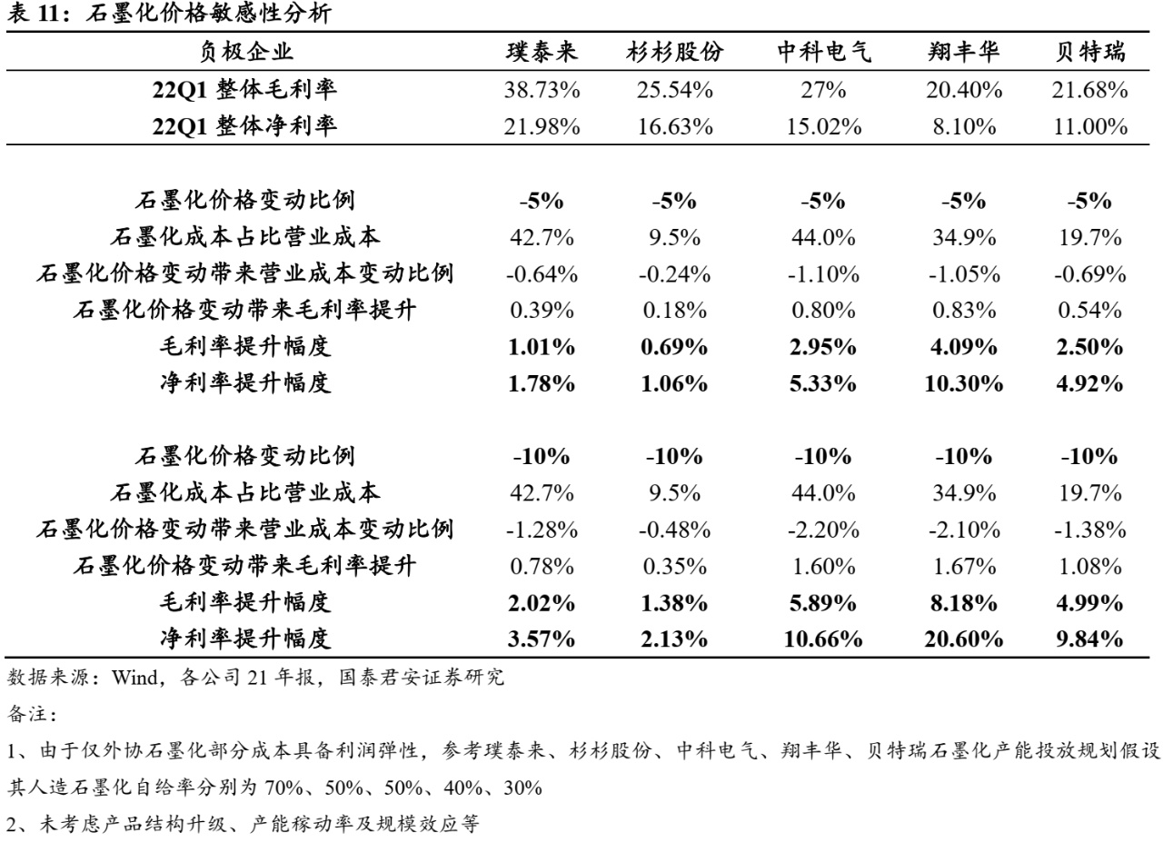 一體化加碼帶來降本空間,負極企業獲得盈利彈性。由于負極產品漲價存在一定時滯且大部分負極企業石墨化自給率有限,21年以來負極企業受石墨化漲價沖擊毛利率均有所下滑。隨著頭部負極企業石墨化產能逐步投產,我們預計負極企業有望明顯受益自身石墨化自給率提升及行業石墨化價格下降帶來的盈利改善。