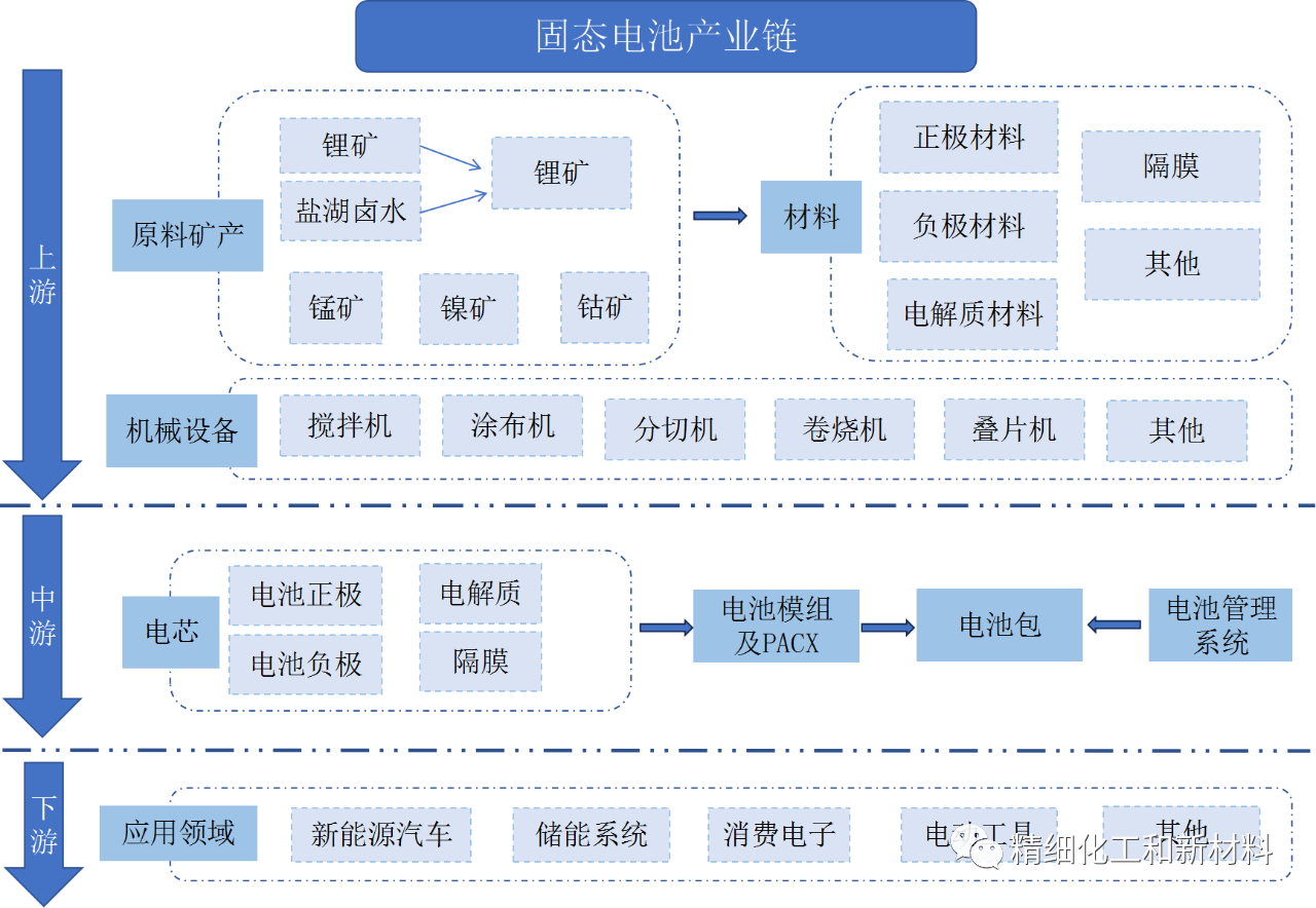 中國粉體網訊 固態電解質電池是鋰電鈉電的最終形態,可以徹底解決安全問題,是新能源下半場當仁不讓的主角。固態電池產業鏈與液態鋰電池大致相似,上游包括原料礦產、機械設備以及基礎材料,兩者主要的區別在于負極材料和電解質的種類,正極材料方面幾乎一致,若完全發展至全固態電池,隔膜也完全被替換。產業鏈中游為電池包的加工制備過程,產業鏈下游應用領域包括新能源汽車、儲能系統、消費電子等。