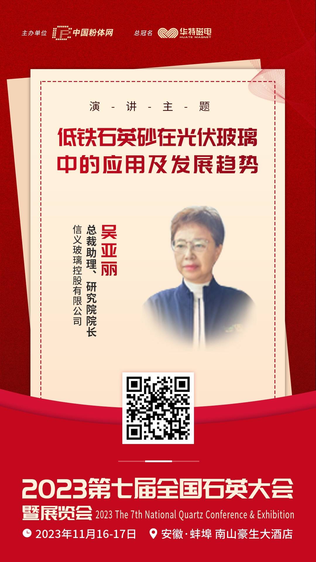 在即將召開(kāi)的2023第七屆全國(guó)石英大會(huì)暨展覽會(huì)(11月16日,安徽蚌埠)上,來(lái)自信義玻璃控股有限公司的總裁助理、研究院院長(zhǎng)吳亞麗女士將作題為《低鐵石英砂在光伏玻璃中的應(yīng)用及發(fā)展趨勢(shì)》的報(bào)告。