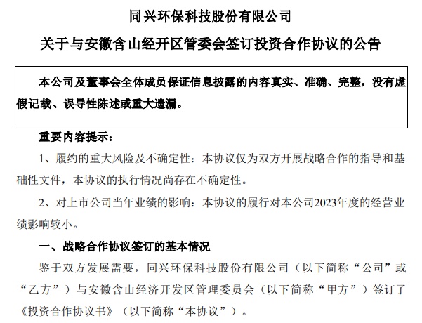 中國粉體網訊 2023年11月11日,同興環保發布公告,鑒于雙方發展需要,公司與安徽含山經濟開發區管理委員會簽訂了《投資合作協議書》。