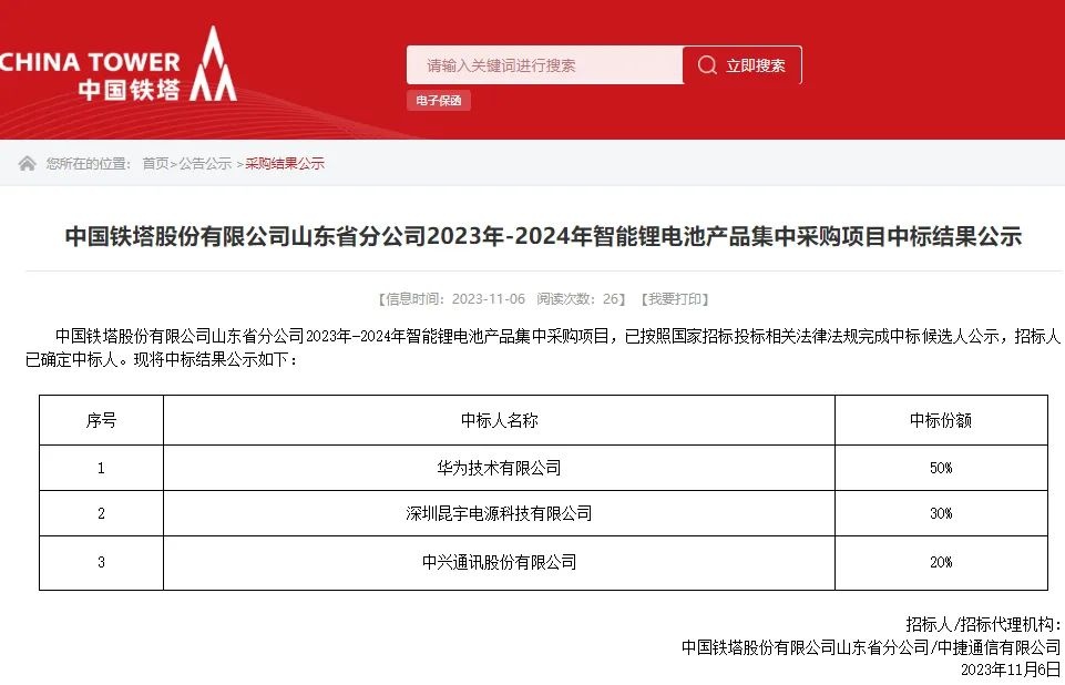 11月6日,中國鐵塔電子采購平臺發布中國鐵塔股份有限公司山東省分公司2023年-2024年智能鋰電池產品集中采購項目中標結果公示。公示信息顯示,華為技術有限公司、深圳昆宇電源科技有限公司、中興通訊股份有限公司三家中標,中標份額分別為50%、30%、20%。據悉,項目為集中招標項目,山東省擬采購28,700組100Ah智能鋰電池,預估不含稅金額17,220萬元。