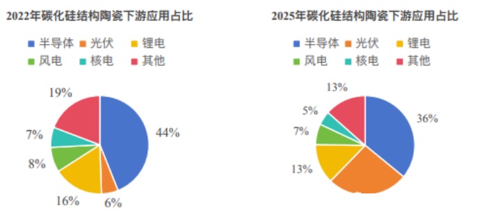 終端旺盛裝機需求持續帶動電池片需求高增,推動光伏產業碳化硅舟托及舟盒替換需求上漲,預計到2025年半導體及光伏行業用碳化硅結構陶瓷占比達62%,其中光伏行業用碳化硅結構陶瓷占比將從2022年6%上升至26%,成為最快增長領域。