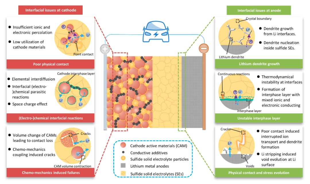 中國粉體網(wǎng)訊 硫化物系全固態(tài)電池中固態(tài)化學(xué)的轉(zhuǎn)化效率目前主要取決于正負(fù)極的界面性質(zhì),包括界面潤濕性,穩(wěn)定性,載流子的遷移速率等。然而,硫化物系全固態(tài)電池中不理想的界面物理和化學(xué)相互作用通常導(dǎo)致高的界面阻抗和差的電化學(xué)性能,主要包括以下幾個(gè)方面: