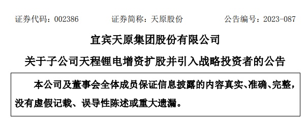 12月5日,天原股份發(fā)布公告,公司董事會(huì)通過(guò)了《關(guān)于子公司天程鋰電增資擴(kuò)股并引入戰(zhàn)略投資者的議案》,公司全資子公司宜賓天程鋰電新材有限公司(簡(jiǎn) 稱“天程鋰電”)擬以增資擴(kuò)股方式引入宜賓羅投資產(chǎn)管理有限公司(簡(jiǎn)稱“羅投資產(chǎn)”)作為戰(zhàn)略投資者。
