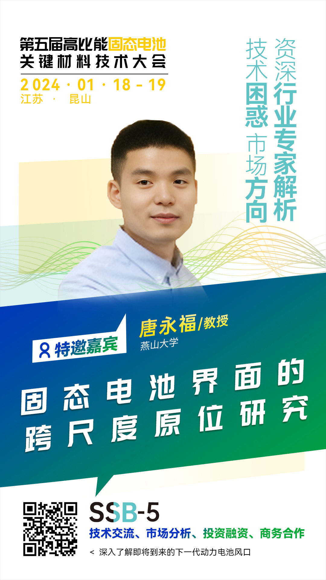 針對固態(tài)電池相關(guān)的技術(shù)、材料、市場及產(chǎn)業(yè)等方面的問題,中國粉體網(wǎng)將在昆山舉辦第五屆高比能固態(tài)電池關(guān)鍵材料技術(shù)大會。為致力于固態(tài)電池技術(shù)開發(fā)的企業(yè),科研院校,以及電動車、儲能、特種應(yīng)用等終端企業(yè)提供信息交流的平臺,開展產(chǎn)、學(xué)、研合作,共同推動行業(yè)發(fā)展。屆時,燕山大學(xué)唐永福教授將作題為《固態(tài)電池界面的跨尺度原位研究》的報告。