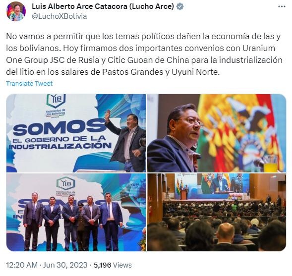 此外,玻利維亞總統阿爾塞6月29日在推特發文稱,玻利維亞方面當日同俄羅斯國家原子能集團旗下國際鈾礦控股公司Uranium One Group和中國中信國安集團簽署兩項重要協議,用于大帕斯托斯和烏尤尼鹽灘的鋰產業化項目。