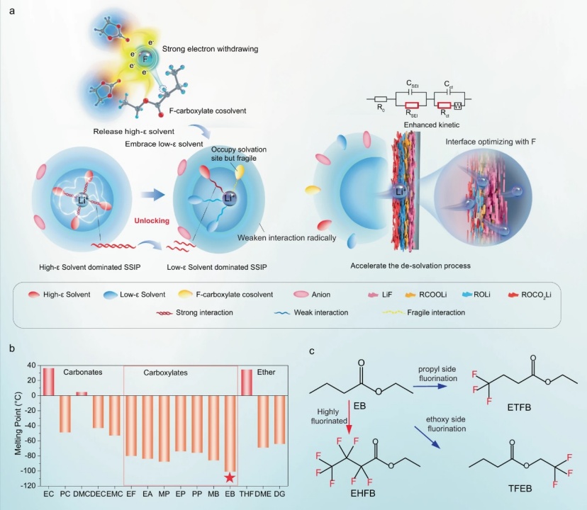 【圖1】a低溫電解質設計原則。b常見碳酸鹽和羧酸鹽溶劑的熔點。c所選EB及其氟化類似物共溶劑的化學結構。