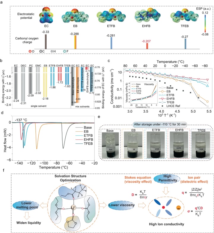 【圖2】a 靜電勢(ESP)圖顯示了本工作中考慮的溶劑分子電荷分布。b Li+與不同溶劑的結合能。c基礎電解質和含有EB、ETFB、EHFB和TFEB的電解質電導率。d上述電解質的DSC曲線。e不同電解質在−110 °C下儲存后的圖像,持續30 min。f溶劑化結構與電解質物理性質的關系。