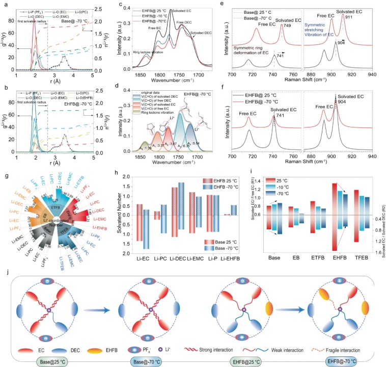【圖3】基于分子動力學(MD)模擬計算出−70°C下基礎電解質(a)和EHFB電解質(b)的徑向分布函數(g(r))和配位數(n(r)。c 在EHFB電解質中不同溫度下EC和DEC的FTIR光譜C=O峰區域。d用Voigt函數擬合−70 °C下EHFB電解質的FTIR光譜。基礎電解質(e)和EHFB電解質(f)中EC的對稱環變形和(C–O)鍵的拉伸振動拉曼光譜。g基于計算的RDF,五種電解質在25 °C時的配位數。h 25 °C和−70 °C下基礎電解質和EHFB電解質中所有溶劑組分與Li+的配位數。i在不同溫度下,基礎電解質和EHFB電解質中的溶劑化EC與游離EC以及溶劑化EC與溶劑化DEC的比值。J當溫度從25°C降低至−70 °C時,基礎電解質和EHFB電解質中溶劑化結構變化示意圖 。