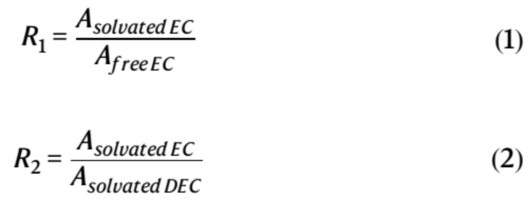 溫度相關的FTIR和拉曼光譜分析進一步證實了共溶劑與主溶劑一起對Li+溶劑化的貢獻(圖3c-f)。游離和溶劑化C=O的IR峰(在1660-1870 cm−1的區域內)用Voigt函數擬合(圖3d)。溶劑化EC與游離EC之比(R1)和溶劑化EC與溶劑化DEC之比(R2)(等式1和等式2)用于量化溶劑化EC的相對豐度以及EC和DEC之間的配位競爭。