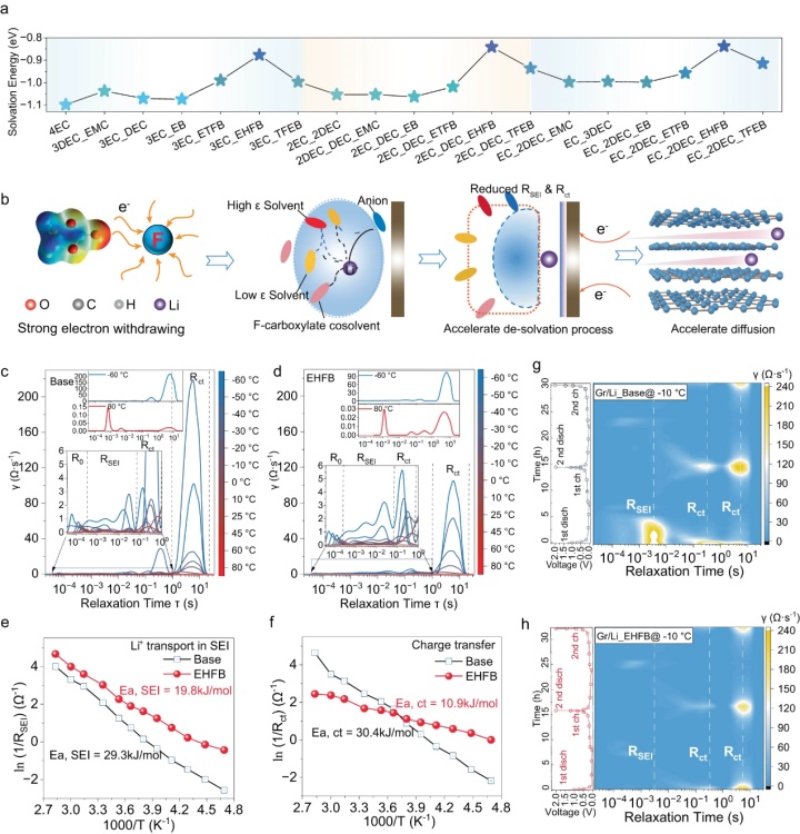 【圖4】a不同電解質中的Li+溶劑化/脫溶劑化能。b氟化共溶劑在削弱Li+和溶劑分子之間的相互作用、加速脫溶劑化和促進Li+擴散方面的關鍵作用。根據采用基礎電解質(c)和EHFB電解質(d)的LCO/Gr軟包電池EIS數據得出的弛豫時間分布(DRT)的溫度依賴性圖。通過Arrhenius擬合Rct(e)和RSEI(f)得到相應的活化能。−10 °C下,采用基礎電解質(g)和EHFB電解質(h)的石墨/Li半電池兩個循環的原位DRT數據。