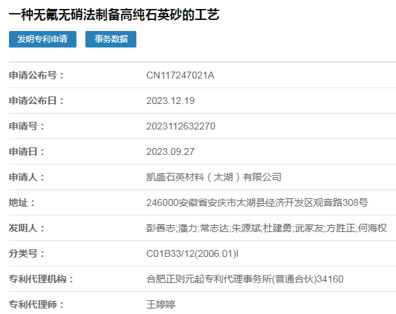 中國粉體網訊 據國家知識產權局公告,凱盛石英材料(太湖)有限公司申請一項發明專利“一種無氟無硝法制備高純石英砂的工藝”。