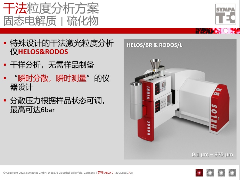 德國新帕泰克有限公司(Sympatec GmbH) 創建于1984年,是從以粉體研究而聞名世界的大學Technical University of Clausthal (TUC) 中分支出來的,集研發、制造、銷售、技術支持為一體的專業粒度粒形分析儀制造商。粒度粒形分析儀測試范圍從0.5 nm到34,000 μm,覆蓋激光衍射法、動態圖像法、光子交叉相關光譜法、超聲衰減法多種測試方法。儀器采用模塊化設計,以適用不同的產品與工藝條件,在具有挑戰性的應用中擁有卓越的性能優勢,完美解決顆粒體系的研發、生產與質量控制難題。新帕泰克在鋰電行業提供從上游到下游各種鋰電材料的粒度粒形檢測解決方案。其中包括干法、濕法激光粒度儀,動態粒度粒形分析儀,納米粒度儀和工業在線激光粒度儀。