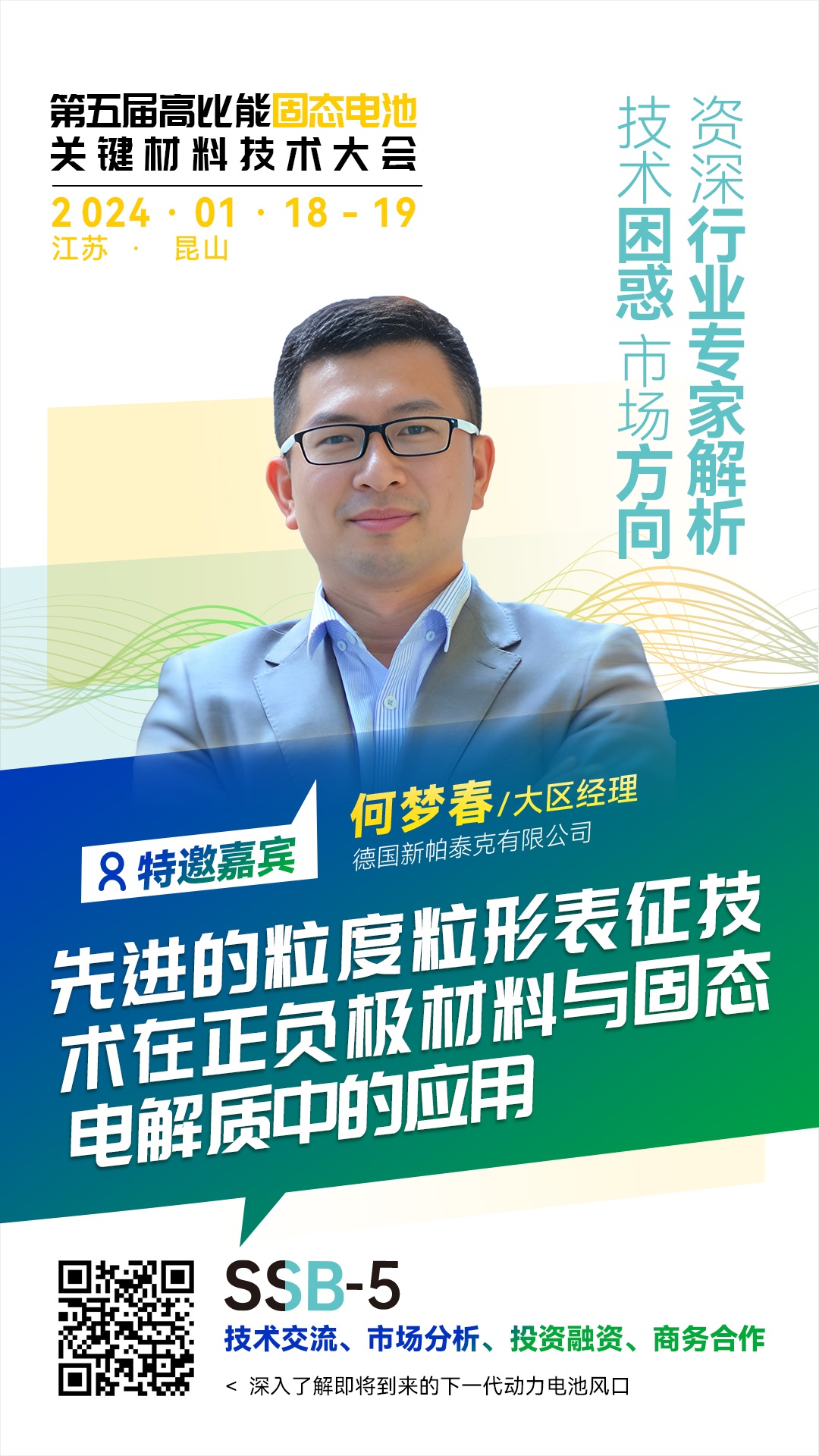 針對固態電池相關的技術、材料、市場及產業等方面的問題,中國粉體網將在昆山舉辦第五屆高比能固態電池關鍵材料技術大會。為致力于固態電池技術開發的企業,科研院校,以及電動車、儲能、特種應用等終端企業提供信息交流的平臺,開展產、學、研合作,共同推動行業發展。屆時,德國新帕泰克有限公司大區經理何夢春將作題為《先進的粒度粒形表征技術在正負極材料與固態電解質》的報告。