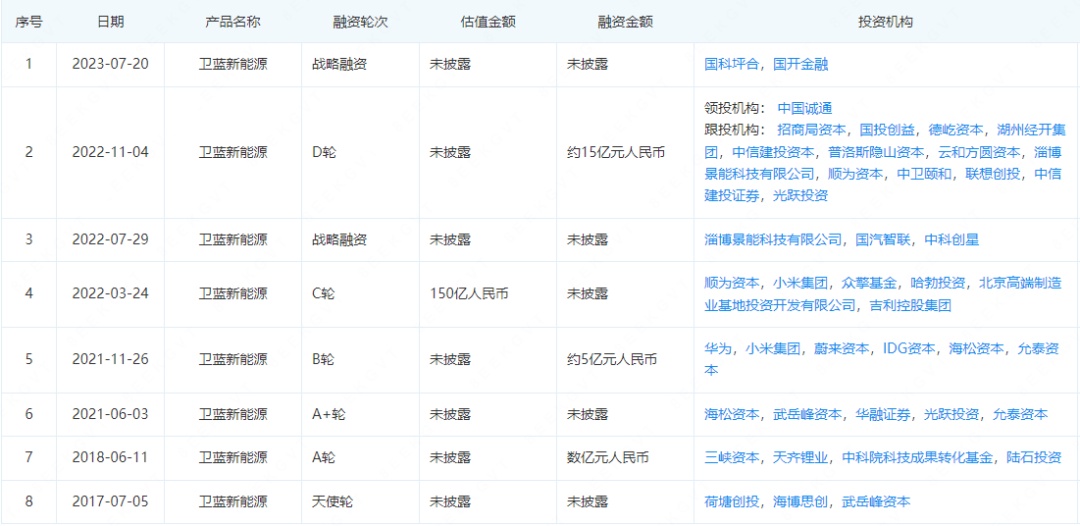 自2017年獲得天使輪投資后,衛藍新能源一共完成8輪融資,小米集團、蔚來資本、吉利控股、華為、天齊鋰業等現身投資方陣容。
