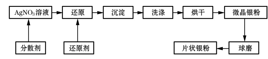 化學(xué)還原法制備片狀銀粉是不經(jīng)過球磨工藝,直接加入抗壞血酸、甲醛、維生素B2、過氧化氫、葡萄糖、維生素C、肼、乙二醇等還原劑直接還原銀鹽而制備出片狀銀粉的方法。
