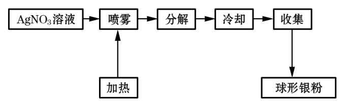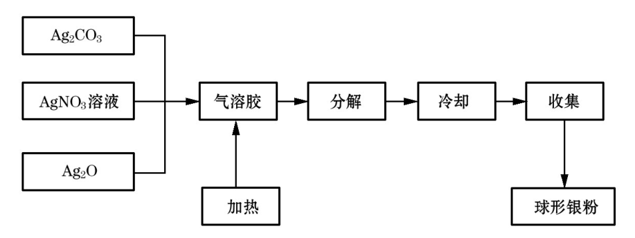 銀鹽分解法使用可以受熱分解的硝酸銀溶液、碳酸銀、氧化銀分散成氣溶膠,在加熱條件下使其分解并燒結(jié)獲得致密球形銀粉。