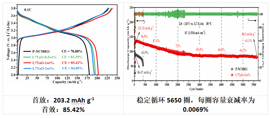 優(yōu)化改善NCM811與硫化物電解質(zhì)之間的界面適配性,可實現(xiàn)數(shù)千圈的穩(wěn)定長循環(huán)及良好的高低溫性能。相關(guān)研究成果以“Coupling Novel Li7TaO6 Surface Buffering with Bulk Ta-Doping to Achieve Long-Life Sulfide-Based All-Solid-State Lithium Batteries”為題發(fā)布在國際知名期刊Journal of Materials Chemistry A上。