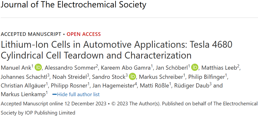 相關研究成果以“Lithium-Ion Cells in Automotive Applications: Tesla 4680 Cylindrical Cell Teardown and Characterization”為題發表在Journal of The Electrochemical Society上。