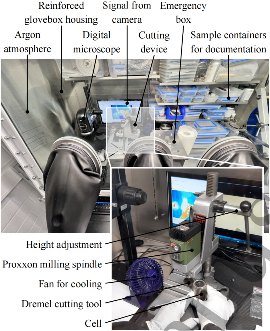 選擇一個完全放電到2.5 V的電池(ID 083/828)進行拆卸(圖1),在手套箱內使用一個帶有直徑為32 mm的切割盤的銑削主軸,以確保切割盤只穿透外殼而不穿透電極。