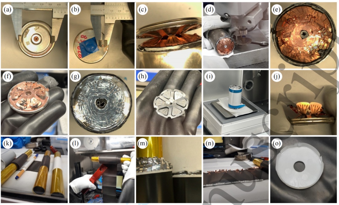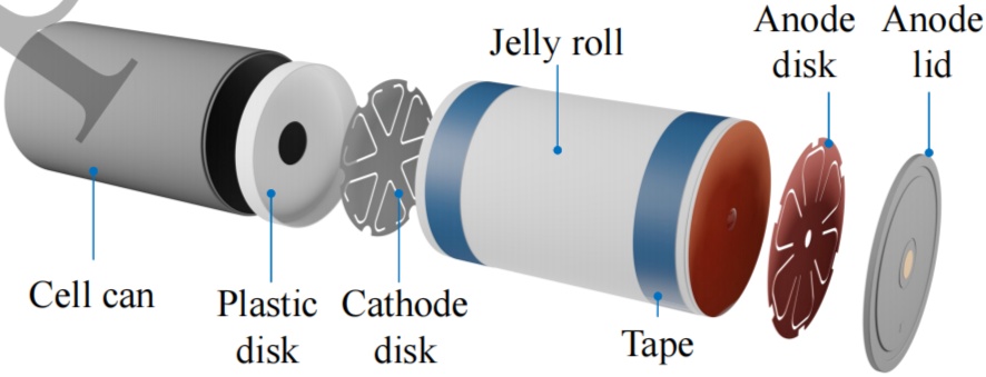 圖5顯示了電池內所有相關部分的分解視圖。其中,電池的圓柱形部分的外徑為46毫米,高度為80毫米。直徑為16毫米的正極端,總高度為80毫米的基礎上再增加1毫米。在負極端,在中心放置一個密封填充孔的銅鉚釘,外殼的厚度被測量為0.5 mm。與18650或21700的普通商業化電池相比,壁厚增加了,降低了能量密度。