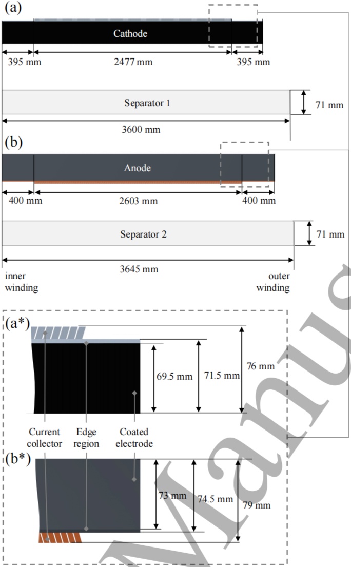 電極繞組由一個雙面涂層正極和負極,以及兩個隔膜組成,這些組件的長度和寬度如圖7所示。由于組件寬度的大小不同,它們以放大的形式描述。電極的結構類似于傳統的卷繞電池設計,負極的總長度為3403 mm,比正極長136 mm。在組裝狀態下,正極完全被負極包裹著。此外,兩個隔膜比電極長,較長的隔膜2處于組裝狀態,再次完全包裹正極、負極和隔膜1的電極組件,并用藍色膠帶固定。