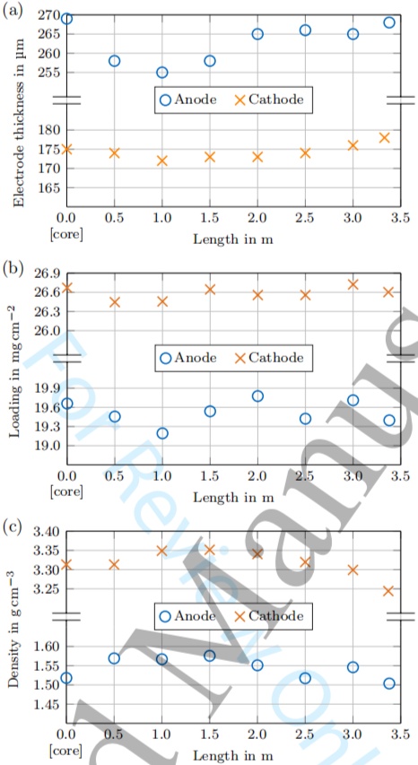 在圖8中,顯示了沿電極的測量厚度和計算出的面積質量載量,長度為0對應于內部繞組核心處的電極位置,可以觀察到,在正極和負極處,繞組開始時的電極厚度在堆芯處最高,然后顯著減小。超過1m的電極長度后,電極厚度再次增加。