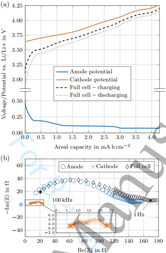 電池拆卸:無極耳設計的六角形對稱的負極和正極在將極柱與殼體連接時,可以充當補償元件或彈簧。與傳統的圓柱形相比,后者不用作結構部件。電極繞組由一個雙面涂層正極和負極以及兩個隔膜組成,而電池芯中沒有芯軸。同時,電極載量幾乎保持不變,但電極厚度變化。在正極側發現了球形活性物質顆粒,而負極則由天然片狀石墨顆粒組成,且經過EDX確認只使用石墨作為活性材料,沒有檢測到硅的存在。此外,聚四氟乙烯的使用可以表明,負極由干法制備,而涂層和銅集流體涂層之間的底漆強烈建議使用無溶劑涂層工藝。更加重要的一點是,三電極分析揭示了電池化學的特征電位和全電池阻抗譜由負極主導。