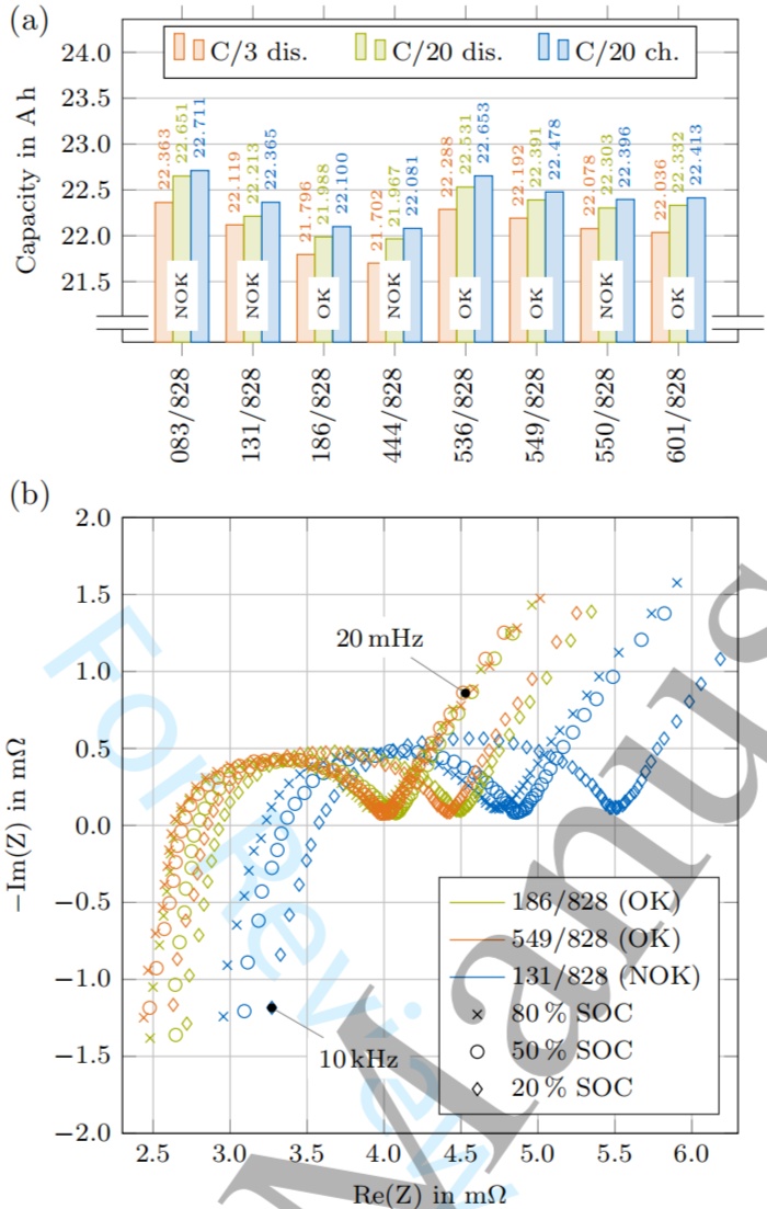 容量和阻抗在不同倍率下單獨測量的數據如圖11,當倍率為C/3時,得到的平均值為22.078 Ah。在C/20時,充電時的平均容量為22.411 Ah,放電時的容量為22.311 Ah。基于ID為083/828的電池的體積電池數據,計算平均電池電壓為3.7 V、C/3放電時的容量值和測量重量為355.9g,由此得到的能量密度為622.4W h/L和232.5W h/kg。同時,三個電池(ID 131/828、186/828、549/828)的阻抗譜在圖11(b)所示,隨著SOC的降低,三個電池的阻抗趨勢與已發表的文獻一致,隨著SOC的降低,半圓增加,特別是在20% SOC時。