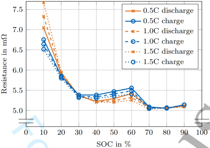 圖13. 不同倍率和不同SOC下的阻抗測試。
