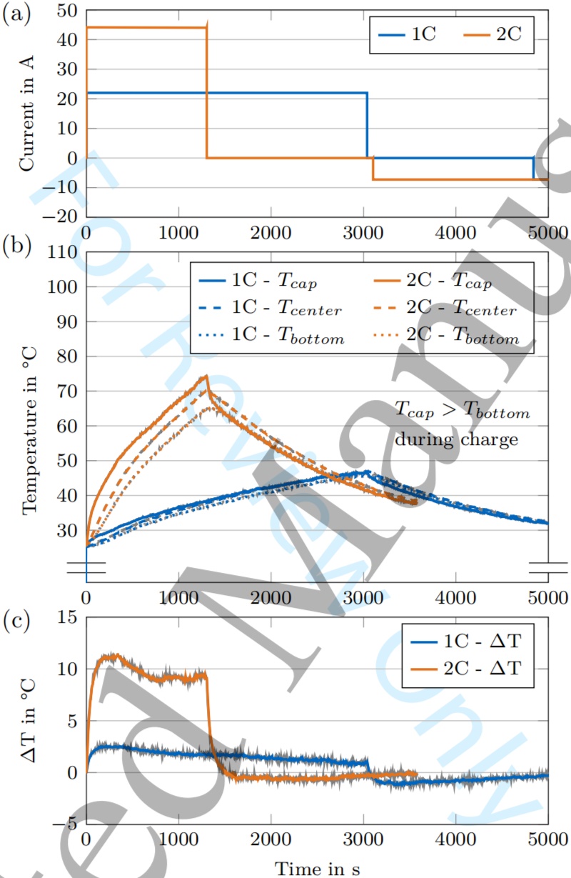 電化學測試表明,特斯拉4680電池展現了622.4W h/L和232.5Wh/kg的能量密度,同時利用混合脈沖功率表征和電化學阻抗譜揭示了不同荷電狀態下的阻抗行為,其中在沒有主動冷卻的情況下以2C充電時,觀察到相對較高的表面溫度(~70℃)。