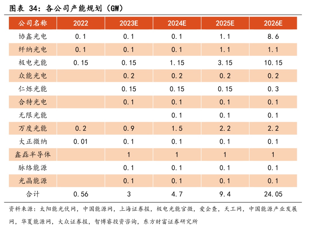 上下游產研聯動,產業化雛形已現。隨著國內鈣鈦礦電池技術突飛猛進,技術產業化有提速趨勢,以協鑫光電、纖納光電、極電光能等一大批優秀企業先后落地鈣鈦礦百兆瓦中試線,并取得優秀的效率表現,目前頭部各家GW級產線均已規劃建設,預計2024年有望落地。同時,傳統晶硅企業依托在晶硅電池上的技術積累,主攻疊層方向,但多數仍處在實驗室階段。