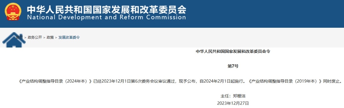 中國粉體網訊 據悉,《產業結構調整指導目錄(2024年本)》已經2023年12月1日第6次委務會議審議通過,并正式公布,自2024年2月1日起施行。《產業結構調整指導目錄(2019年本)》同時廢止。