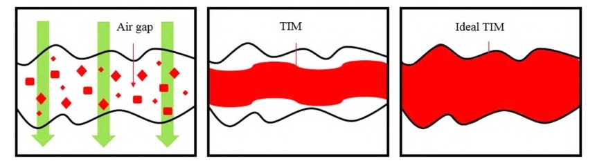 目前被廣泛應用在電子散熱等領域的材料是熱界面材料(TIM)。電子器件接觸面為固體表面相互接觸,中間存在著微觀凹凸不平的空隙,實際接觸面積僅1%到2%,空氣的熱傳導率極低僅為0.026W/(m·K),屬于不良導體,散熱效果差。當熱量傳導經過接觸界面時會受到界面熱阻,此時在間隙中添加合適的熱界面材料可以排除空氣,形成緊密連接的熱傳導通道,大幅度降低接觸熱阻,充分發揮其散熱作用。