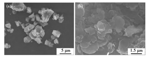 掃描電子顯微鏡下導熱填料形貌圖:(a)氮化鋁,(b)氮化硼