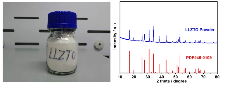 通過公司合成工藝生產的固體電解質Li6.5La3Zr1.5Ta0.5O12(LLZTO)粉體,外觀為白色粉末,粉末顆粒粒徑分布均勻,粉末粒徑d50=500nm。LLZTO的粉末通過XRD測試,衍射峰尖銳,說明LLZTO顆粒結晶性非常好,其所有衍射峰均屬于PDF#45-0109,并未出現其他雜質峰,說明制備的LLZTO粉末純度高。此外,對LLZTO粉體進行主含量和雜質離子檢測,檢測結果表明,公司生產的LLZTO粉末主含量高達99.95%,其他雜質離子含量非常少,其含量遠遠低于檢測標準。