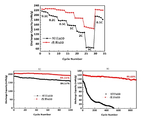 相對于傳統的電池而言,鈷酸鋰電池的能量密度更大,在同等容量情況下可以更加輕薄,并且可以在高壓環境下充放電,放電高效安全,穩定性強。制備的高電壓(4.6V)LCO表現出良好的結晶性和高的壓實密度,具有比容量高,倍率性能好,容量衰減小的特點。以3~4.6V為電壓窗口,材料在0.2C下放電比容量為226mAh/g,1C下放電比容量為210mAh/g,5C下放電比容量>160mAh/g。材料循環900圈,容量保持率為85.6%,該性能處于先進水平。