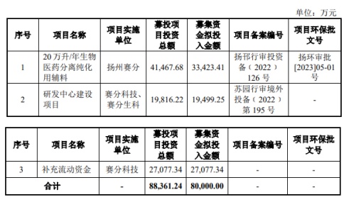 招股說明書顯示,賽分科技擬募集資金80000.00萬元,分別用于20萬升/年生物醫藥分離純化用輔料、研發中心建設項目、補充流動資金。