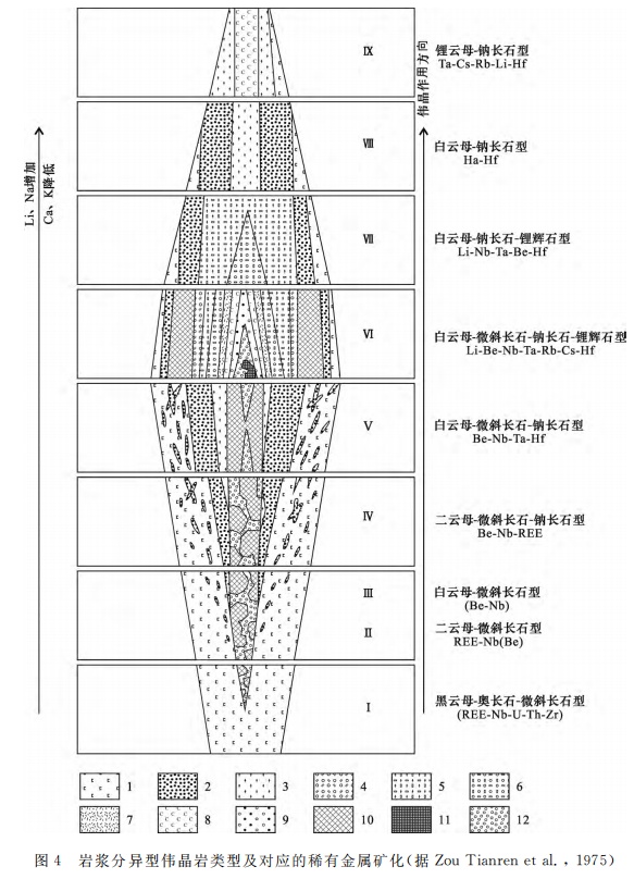 在索洛多夫分類方案基礎上,綜合考慮了云母類(黑云母、二云母、白云母、鋰云母)和長石類礦物對偉晶巖演化和稀有金屬礦化特征的指示作用,把花崗偉晶巖可分為四類九型,如下圖所示,這種分類方案對于確定偉晶巖脈的結構分帶型式和礦化類型較為直接有效。