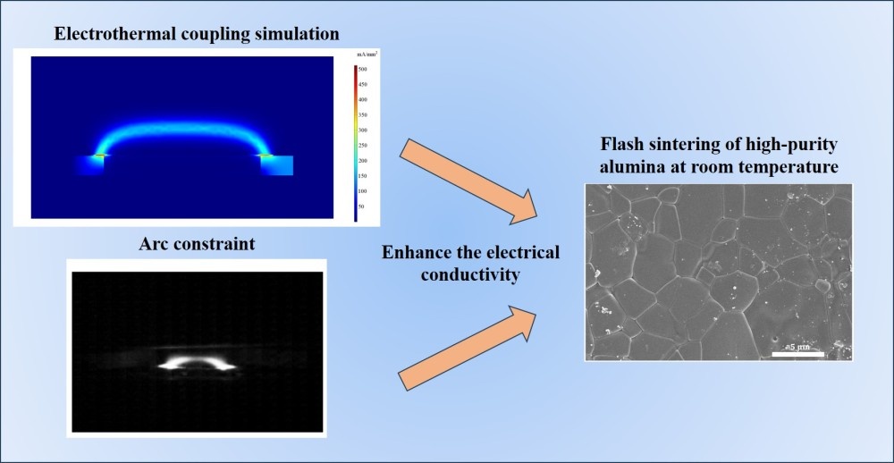 本次研究中,研究人員采用有限元模擬方法分析了電弧誘導閃速燒結過程中電弧與高純度氧化鋁樣品之間的電-熱偶聯,揭示了電弧對氧化鋁樣品的熱效應和電效應,最終據此提高了氧化鋁樣品的電導率,并在電弧約束下(電弧約束裝置位于樣品上方),在60kPa下實現高純度氧化鋁的閃速燒結。氧化鋁樣品實現的相對密度為98.7%。該項技術證實在室溫下廣泛適用于包括離子導體、半導體,甚至絕緣體等。